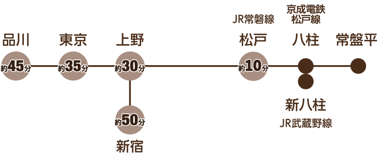 JR武蔵野線「新八柱駅」下車、京成電鉄松戸線「八柱駅」にて